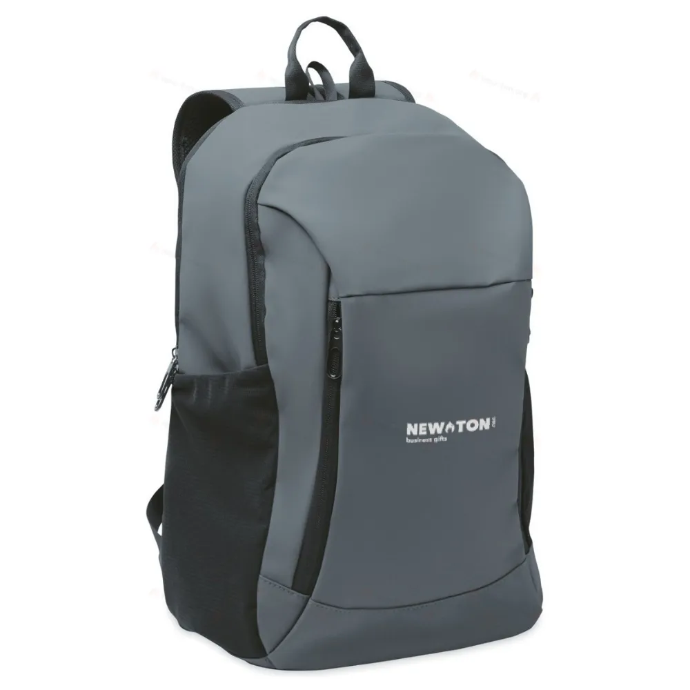 Рюкзак для ноутбука 15 дюймов из полиуретана с мягкой спинкой и основным отделением на молнии. Передний карман на молнии, 2 передних боковых кармана на молнии и 2 эластичных сетчатых боковых кармана. Подкладка из 210D RPET.