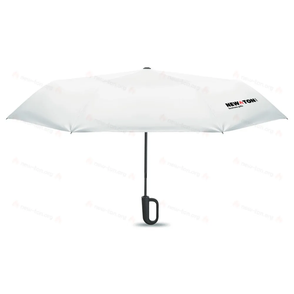 "Складной ветроустойчивый зонт 21"" из эпонжа RPET 190T с каркасом и спицами из стекловолокна. D-образная ручка-карабин с резиновым покрытием. Автоматическое открывание и закрывание. В комплект входит чехол."