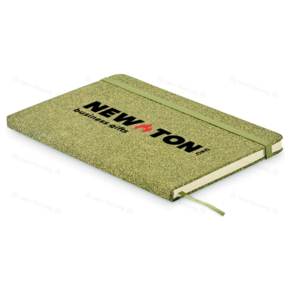 Блокнот А5 в твердой обложке из 20% чайного порошка, 30% пробки и 50% поликоттона. В футляре. 160 линованных страниц из переработанной бумаги (80 листов/70 г/м²). Резинка в цвет блокнота и лента-закладка.