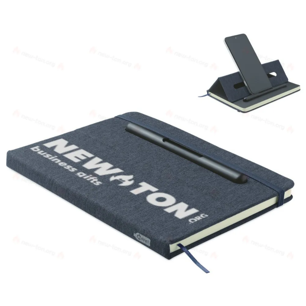 Блокнот формата A5 в твердой обложке из RPET с функцией держателя для телефона. В комплекте ручка 2-в-1: бесчернильная и обычная шариковая ручка из пластика. Переплет. 192 страницы из переработанной бумаги в линейку (96 листов). Резинка и закладка в цвет блонота.