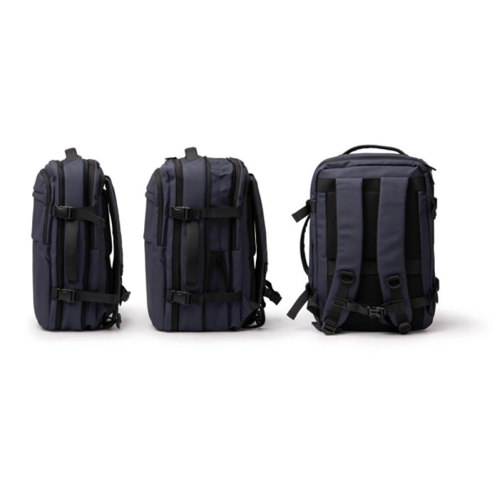 Путешественный рюкзак из искусственной кожи. Обивка спинки и лямок для плеч. Передний отдел с внутренними карманами. Небольшой передний карман. Основной отдел с сетчатым разделителем на молнии. Специальный двойной отсек для ноутбуков до 15" и других устройств. Регулируемые размеры благодаря расширяемой молнии. Ремень для крепления к чемодану. Вместимость: 30 л.