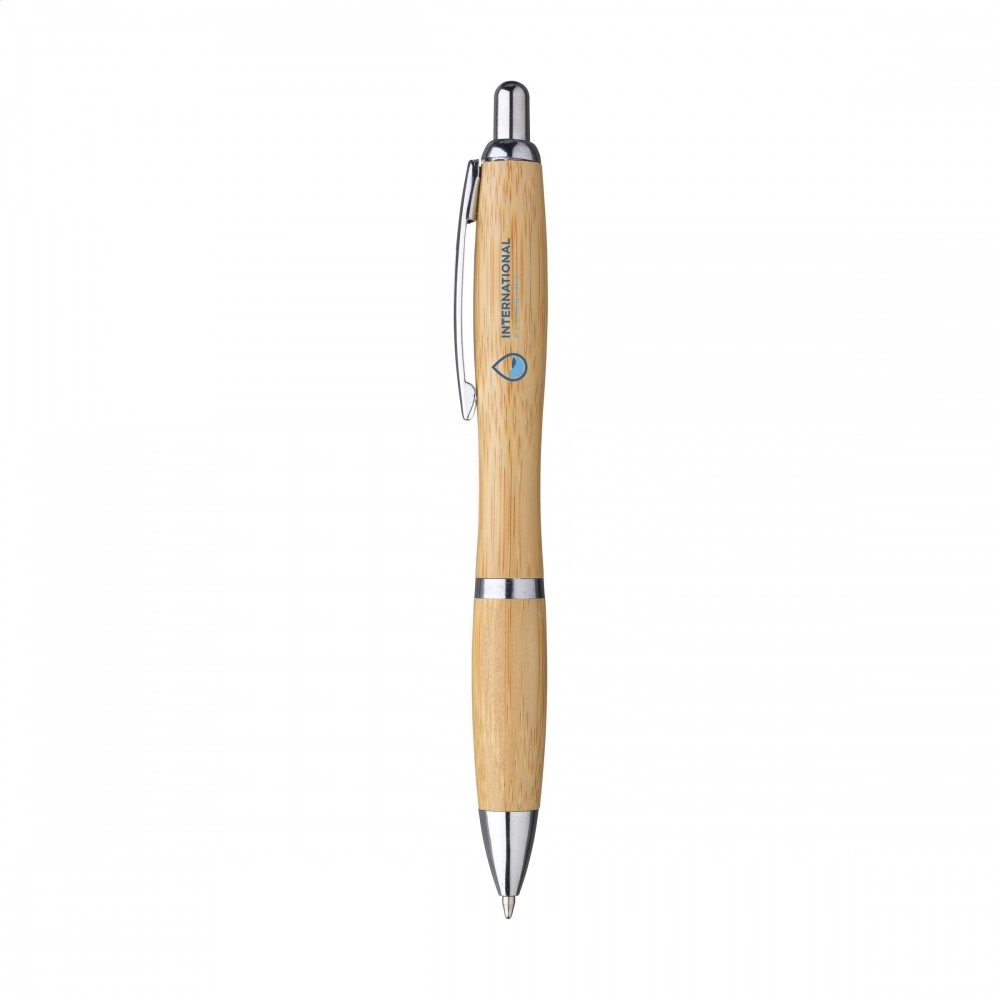 Шариковая ручка с синей чернилами из бамбука, с металлическим зажимом и серебристыми акцентами.