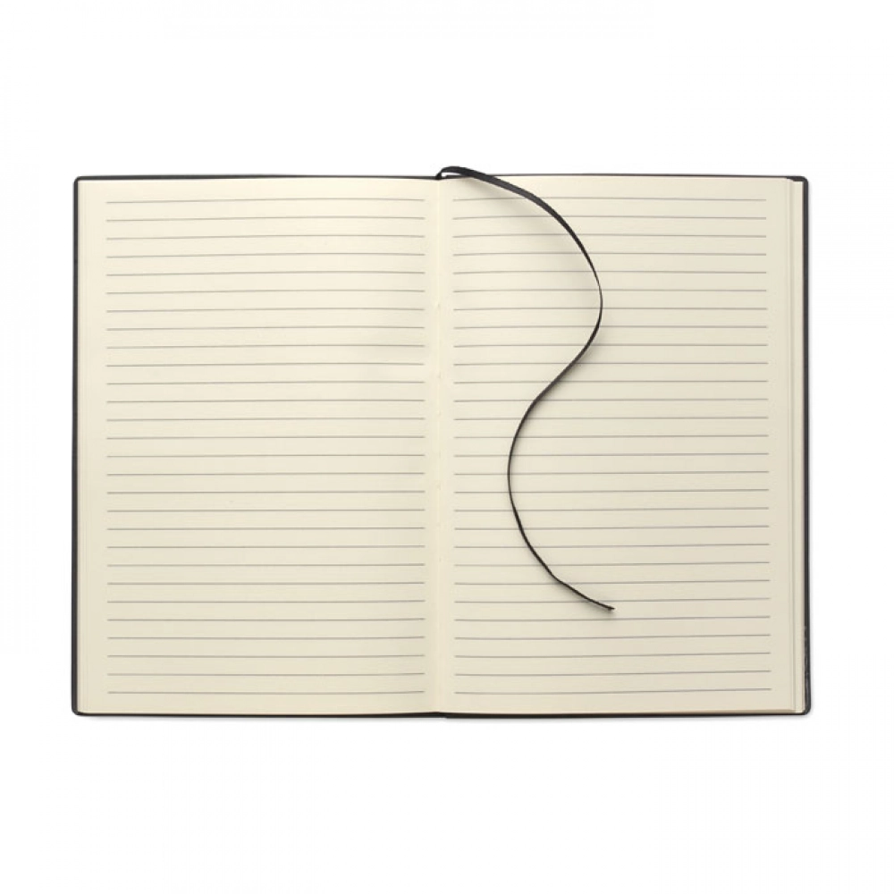 Блокнот формата А5 в мягкой обложке из полиуретана. В переплете. 160 линованных страниц из переработанной бумаги (80 листов). Эластичная резинка и закладка. Металлический шильд спереди.