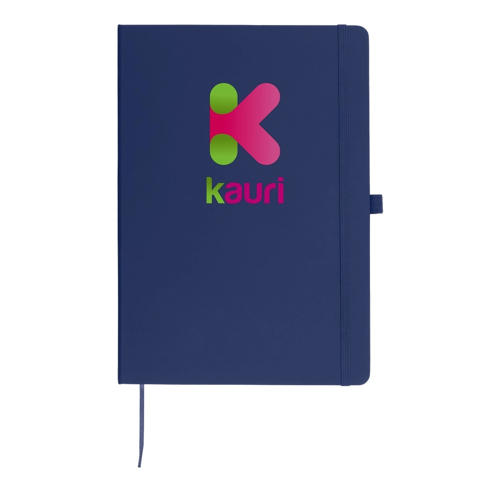 Блокнот примерно формата A4 с 96 линованными страницами (70 г/м²), лямкой-закладкой для удобного отмечания важных заметок или последней страницы, дополнительным эластичным держателем для ручки, обложка из ПУ.