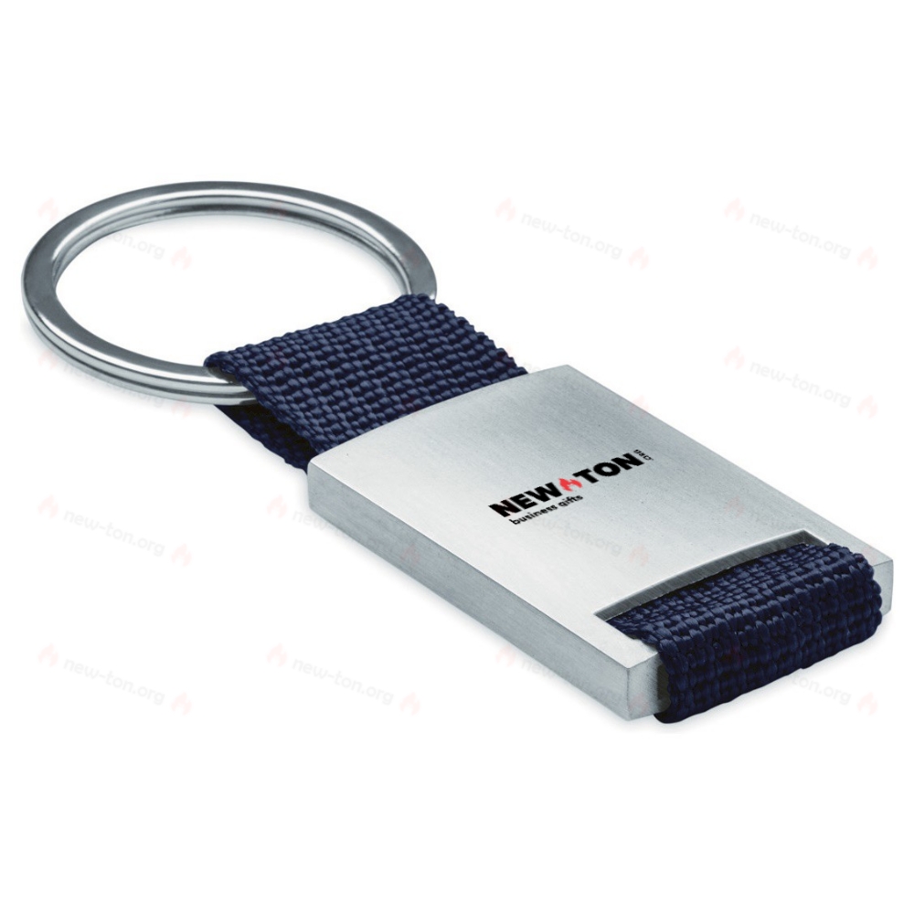 Metal rectangular key ring with coloured polyester webbing. Individually packed in a carton gift box.