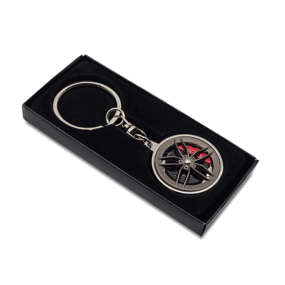 Идеальный гаджет для любителя автомобилей! Брелок в форме обода колеса с деталями тормозной системы. Упакован в черной подарочной коробке.