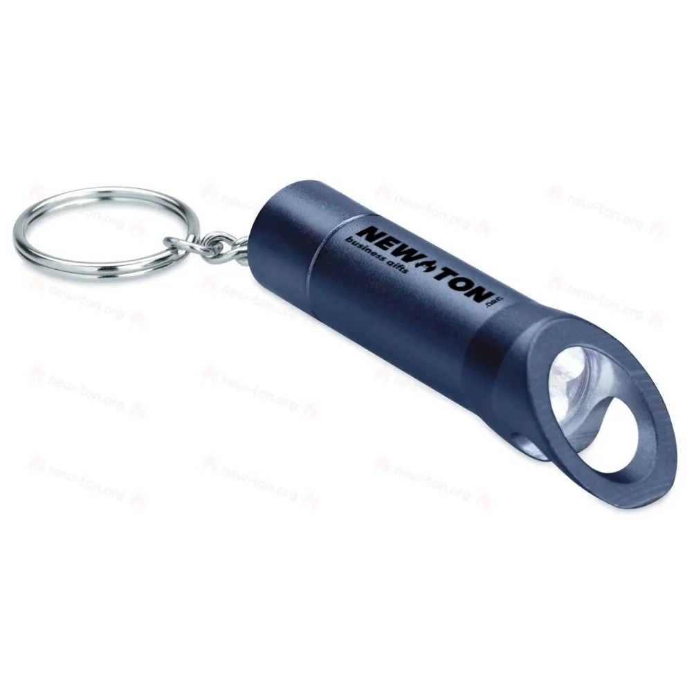 Металлический брелок-фонарик с LED подсветкой и открывалкой для бутылок. В комплекте 3 батарейки.