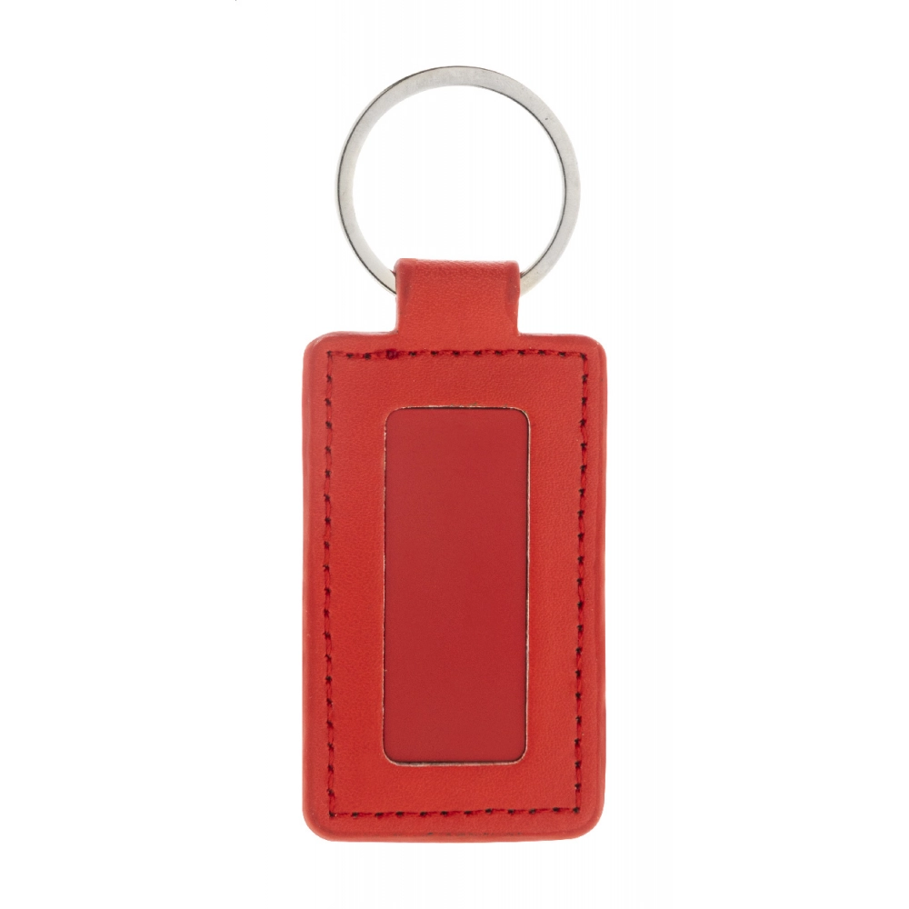 Прямоугольный брелок из переработанной кожи PU с металлическим кольцом и пластиной с логотипом из нержавеющей стали с резиновым покрытием. Специальное покрытие для зеркальной лазерной гравировки.
