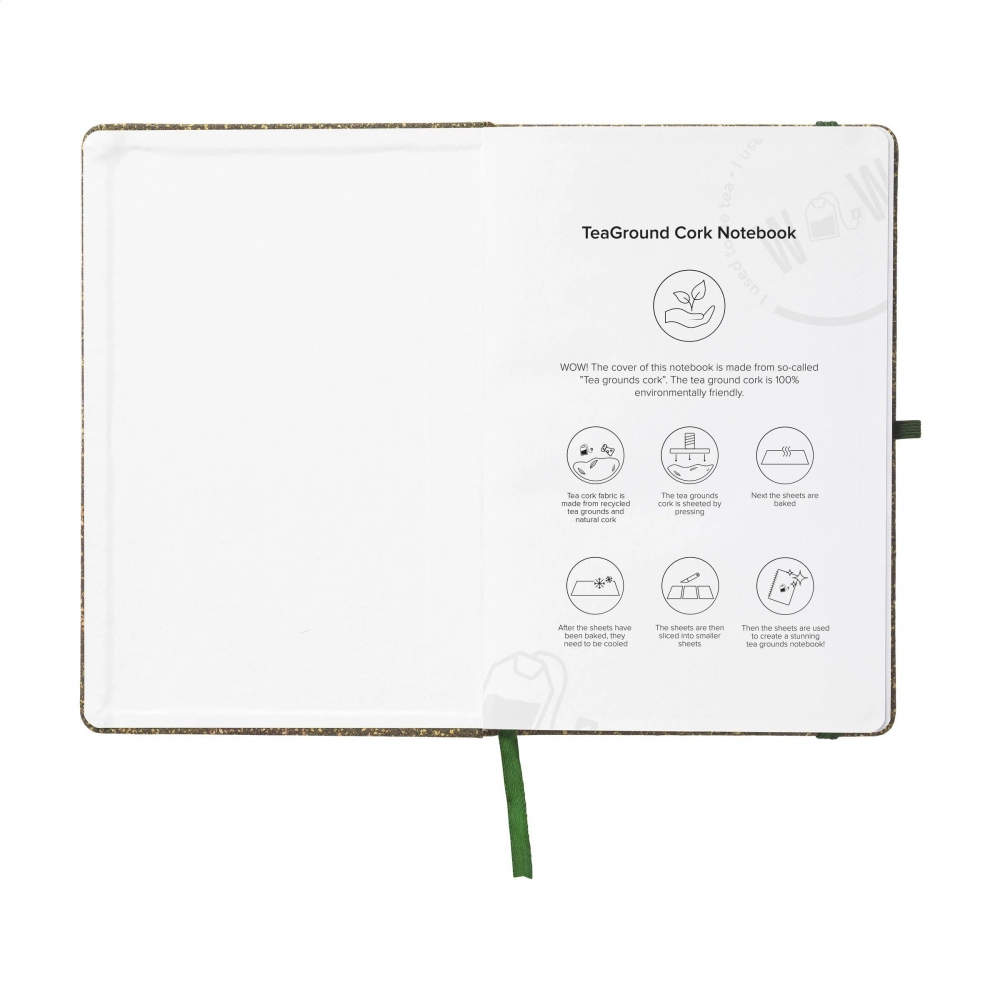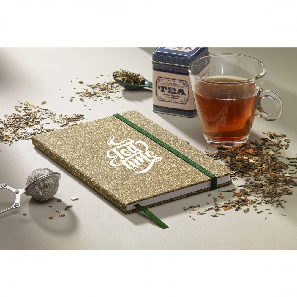 Блокнот формата A5. Прочная обложка из картона, сертифицированного FSC, покрыта смесью отходов чайных листьев, пробки, полиэстера и хлопка. В результате получается стильная обложка в различных оттенках зеленого и коричневого с натуральным видом. Блокнот содержит около 96 листов/192 страницы белой, линованной, переработанной бумаги, сертифицированной FFSC Mix (70 г/м²). Оснащен петлей для ручки, эластичной застежкой и шелковой лентой. Использование использованных чайных листьев в качестве основы для создания новых материалов, таких как эта обложка, продлевает жизненный цикл чайных листьев. Из-за использования органических материалов цвет обложки может немного отличаться в зависимости от блокнота или партии. Обратите внимание: из-за грубости ткани возможность нанесения мелких деталей логотипа, тонких линий и маленьких букв ограничена. Поэтому, после получения вашего логотипа, мы можем порекомендовать вам скорректировать или увеличить его.