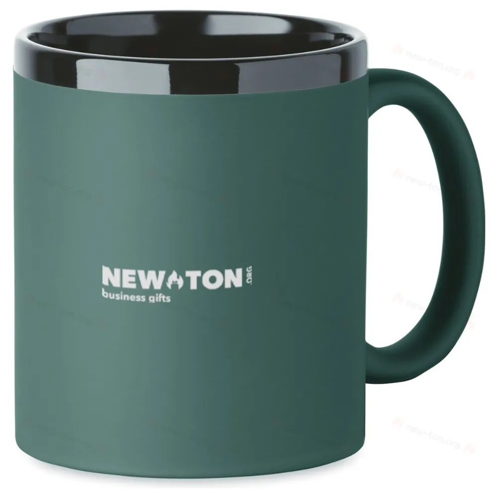 Керамическая кружка с покрытием soft touch, черной внутренней частью и ободком. Подходит для гравировки. Емкость: 300 мл. Упакована в белую картонную коробку.