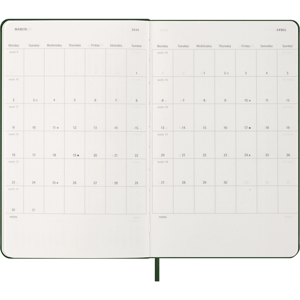 Дневник MOLESKINE (примерно формата А5, большой), с твердой обложкой, на каждый день (400 страниц), с ляссе и резинкой для закрытия.