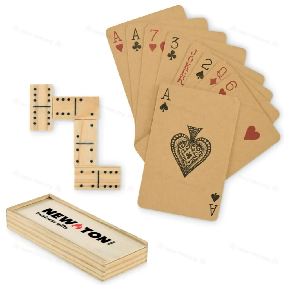 Набор игр, включающий в себя колоду карт из переработанной бумаги и деревянное домино. Представлен в коробке из МДФ.