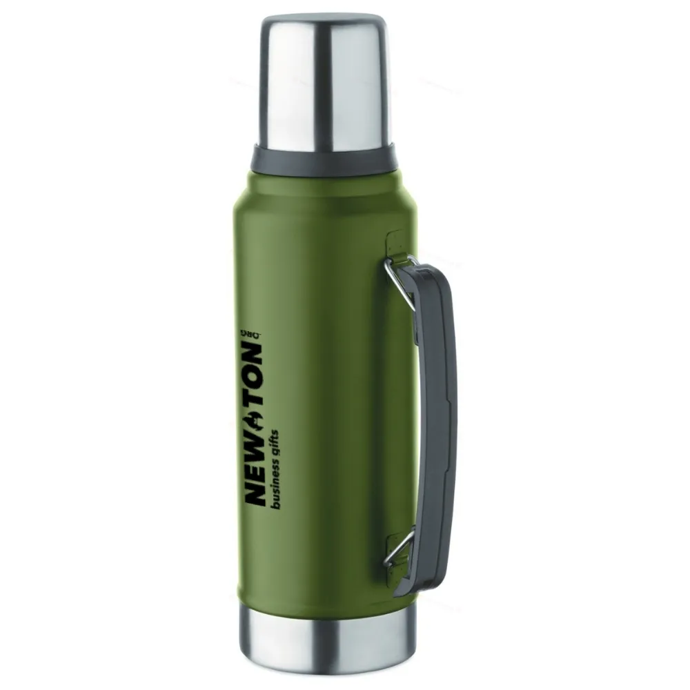 Термос с двойными стенками из переработанной нержавеющей стали 90% и 10% нержавеющей стали с боковой ручкой, крышкой из полипропилена и чашкой из переработанной нержавеющей стали. Герметичный. Емкость: 1 л.