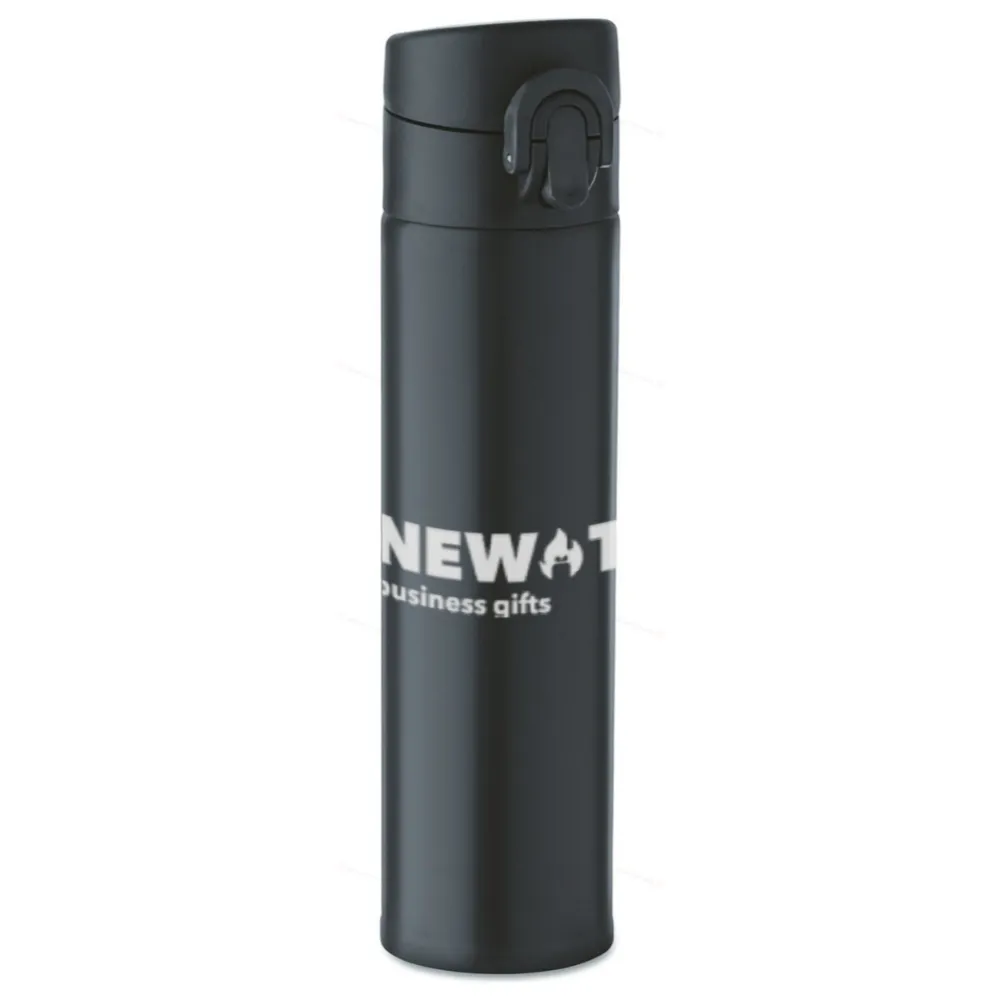 Термобутылка с двойными стенками из переработанной нержавеющей стали 90% и 10% нержавеющей стали с замком от проливания на крышке и опцией нажатия для открытия. Герметичная. Емкость: 300 мл.