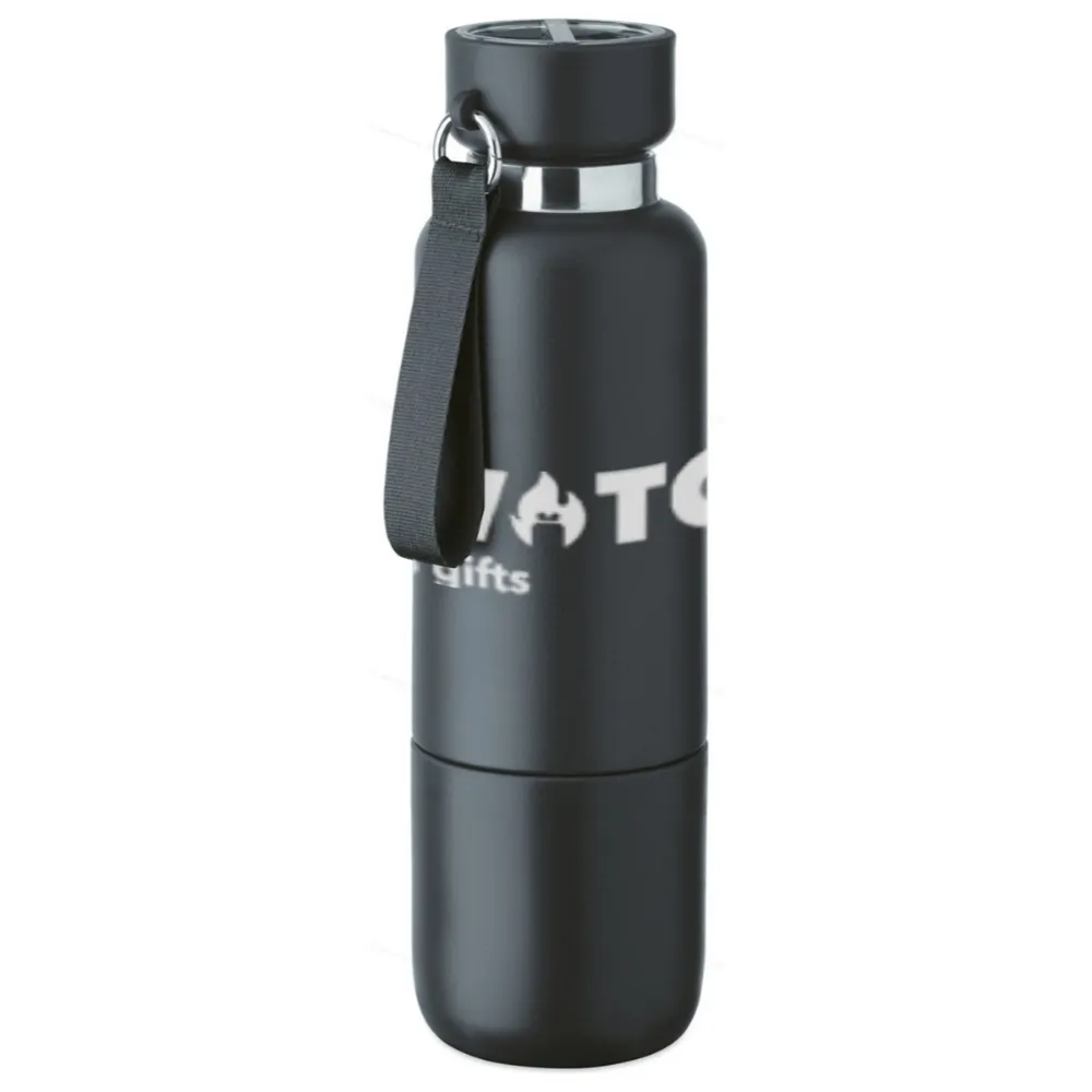 Термобутылка с двойной изоляцией из 90% переработанной нержавеющей стали и 10% нержавеющей стали с ручкой-ремешком и дополнительным длинным ремнем (70 см) в крышке из полипропилена. Герметичная. В комплект входит чашка. Емкость: 500 мл.
