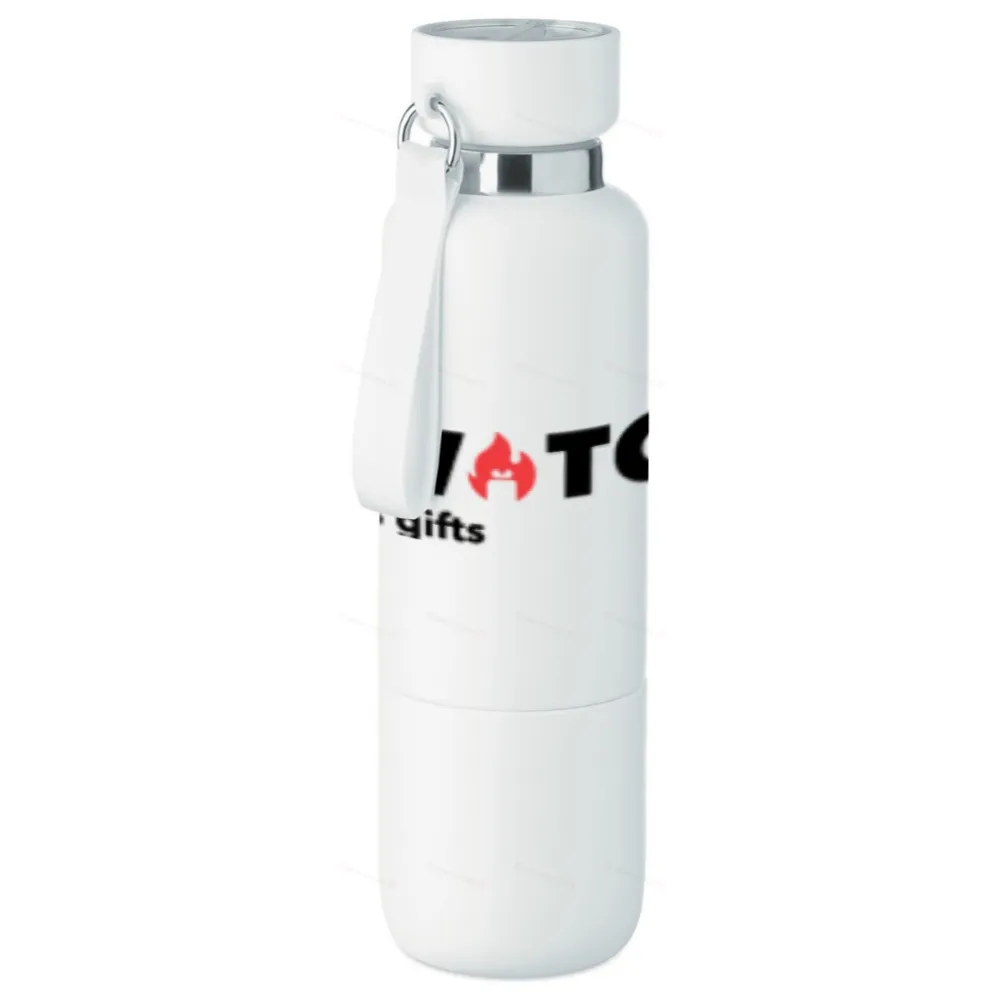 Термобутылка с двойной изоляцией из 90% переработанной нержавеющей стали и 10% нержавеющей стали с ручкой-ремешком и дополнительным длинным ремнем (70 см) в крышке из полипропилена. Герметичная. В комплект входит чашка. Емкость: 500 мл.