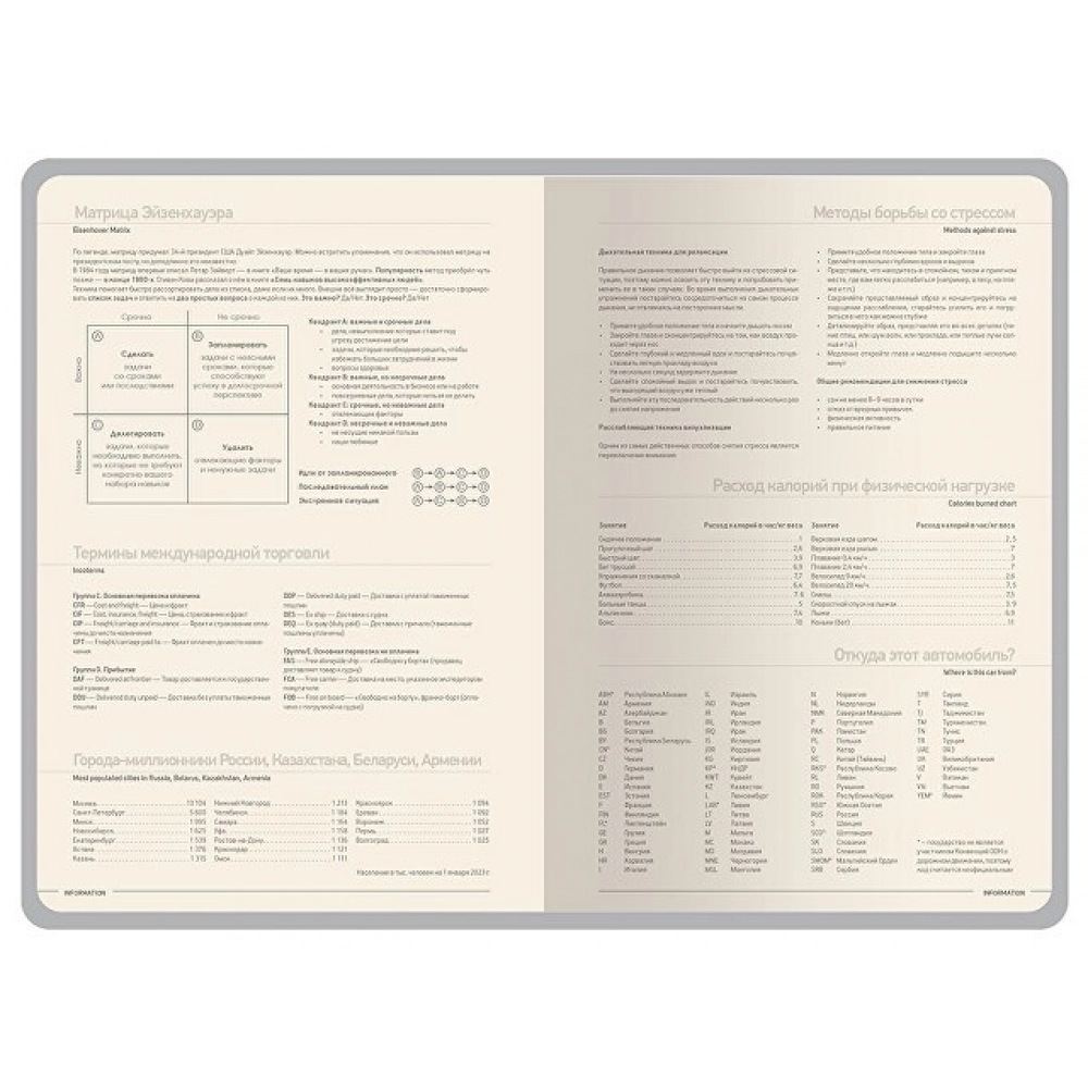 Элегантный датированный ежедневник "Megapolis Color" от Bruno Visconti идеально подходит для организации рабочего дня и ведения важных записей. Обложка из искусственной кожи с приятным на ощупь покрытием Soft Touch и обрез в тон создают гармоничный образ. Внутри – блок из бежевой бумаги плотностью 70 г/кв.м с разделами для планирования, календарем на 2026-2027 год и полезной справочной информацией. Для удобства навигации предусмотрена закладка-ляссе шириной 7 мм в цвет обложки.