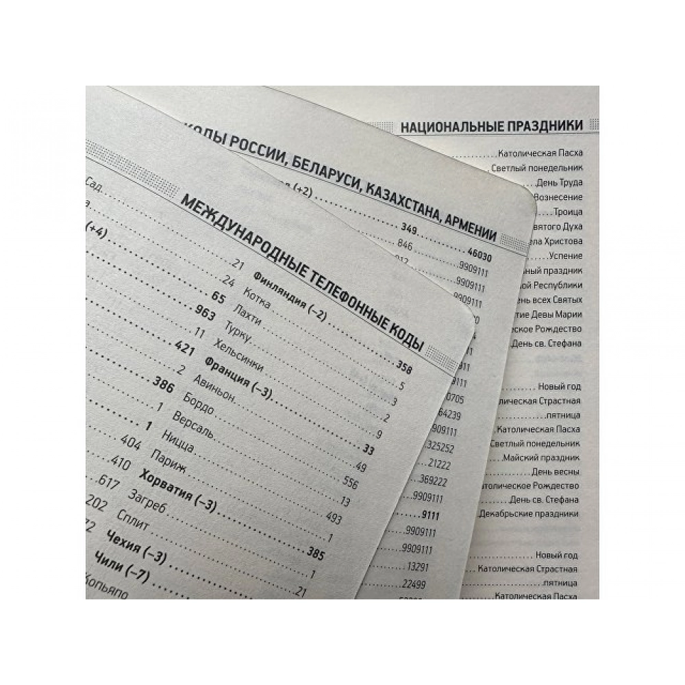 • справочная информация на 19 страницах (аэропорты Европы, штрихкоды, международные телефонные коды, цифровые автомобильные коды, энергетическая и питательная ценность продуктов, национальные и религиозные праздники, единицы измерения, страны мира, размеры одежды, форматы бумаги и др.);