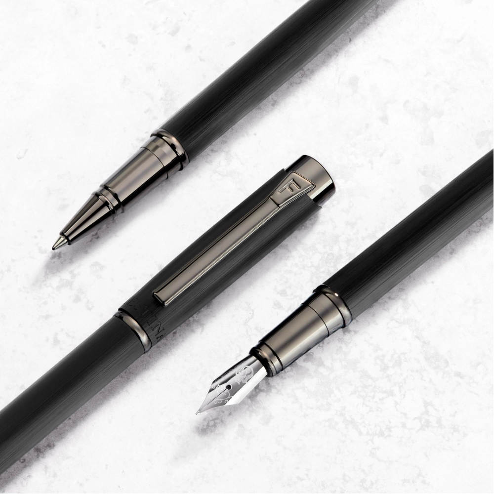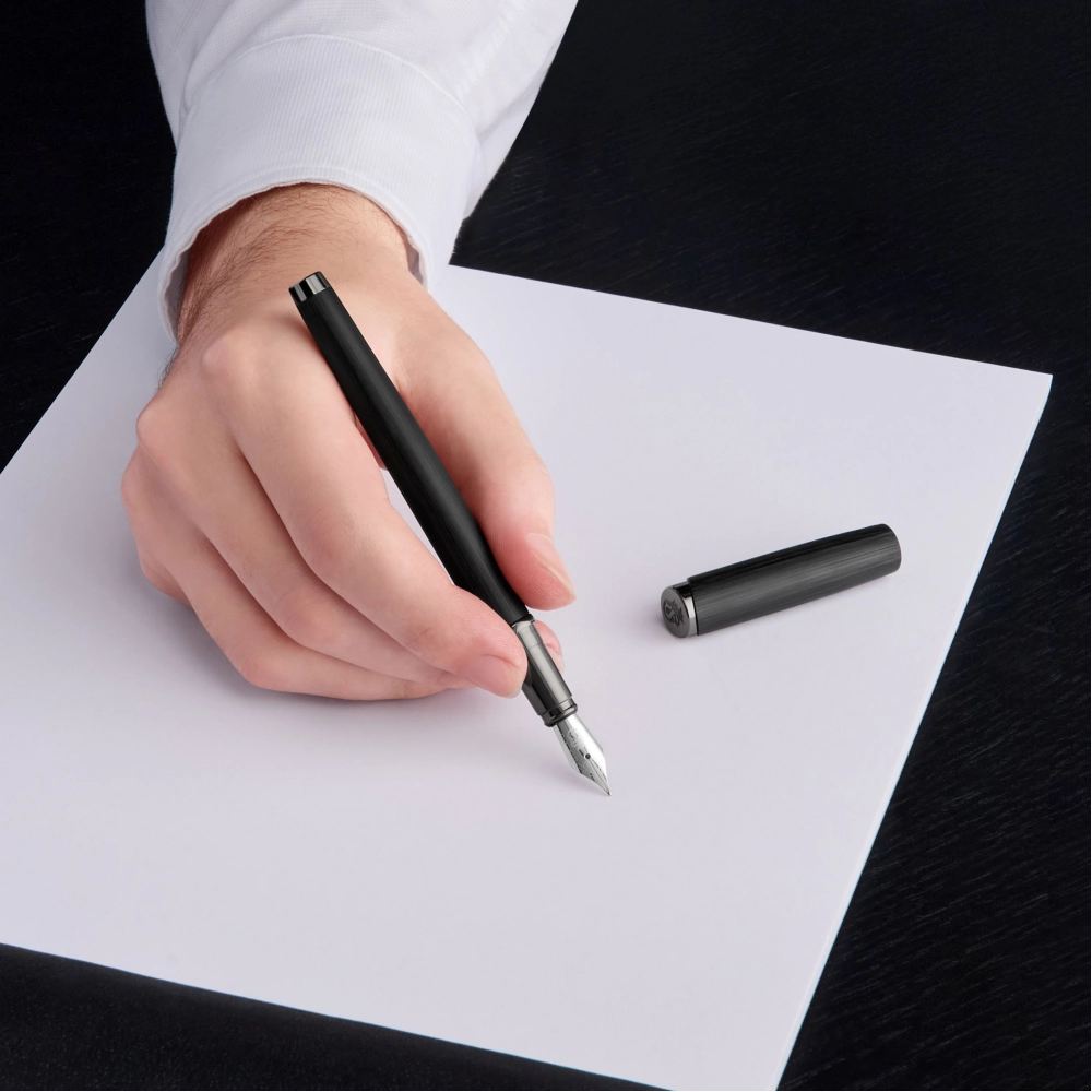 Новая перьевая ручка "Originals" из черного матового алюминия с блестящей отделкой под пистолет - элегантный и универсальный пишущий инструмент. Смелая черная отделка придает минималистичному корпусу современный вид, а блестящая отделка в виде пистолета создает яркий контраст. Продуманный до мелочей клип с гравировкой F, отличительный герб в верхней части и отделка из матового алюминия обеспечивают легкую и непринужденную привлекательность. Созданная для точности и практичности, эта ручка органично сочетает в себе стиль и функциональность, что делает ее идеальным выбором для решения любых письменных задач.