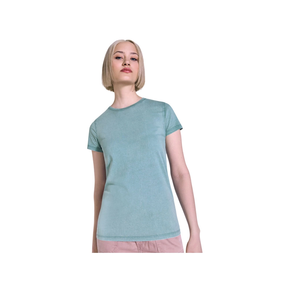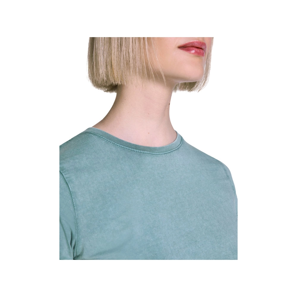 Женская футболка с коротким рукавом из 100% хлопка с аксидной стиркой. Круглый вырез горловины из риба 1х1. Отстрочка в тон по горловине.
