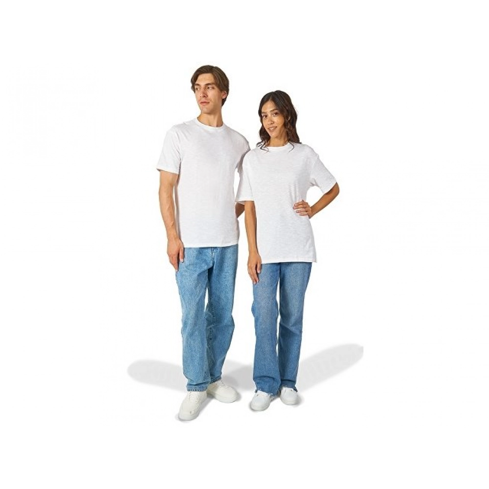 Полотно футболки имеет необычную структуру - с протяжками, но при этом гладкую поверхность, что обеспечивает идеальную поверхность для нанесения: прямая печать, трафаретная или термотрансфер прекрасно ложатся на такое полотно. Декоративная отстрочка по низу рукавов и изделия, а также отстрочка по горловине позволяют футболке дольше сохранять форму. - необычная полотно - идеальный поверхность для нанесения - универсальный прямой силуэт