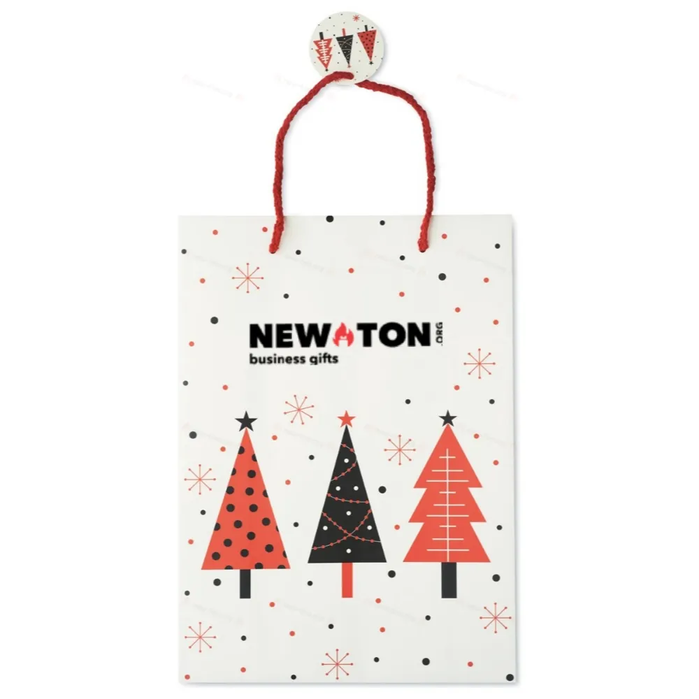 Большой подарочный новогодний бумажный пакет (30% переработанного материала) с биркой на ручке. 150 г/м².