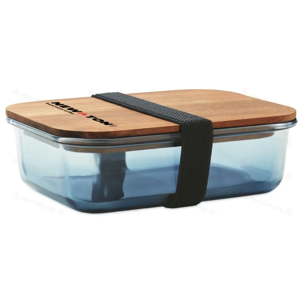 Стеклянный ланч-бокс с крышкой из древесины акации и эластичной лентой из RPET. Объём: 800 мл.