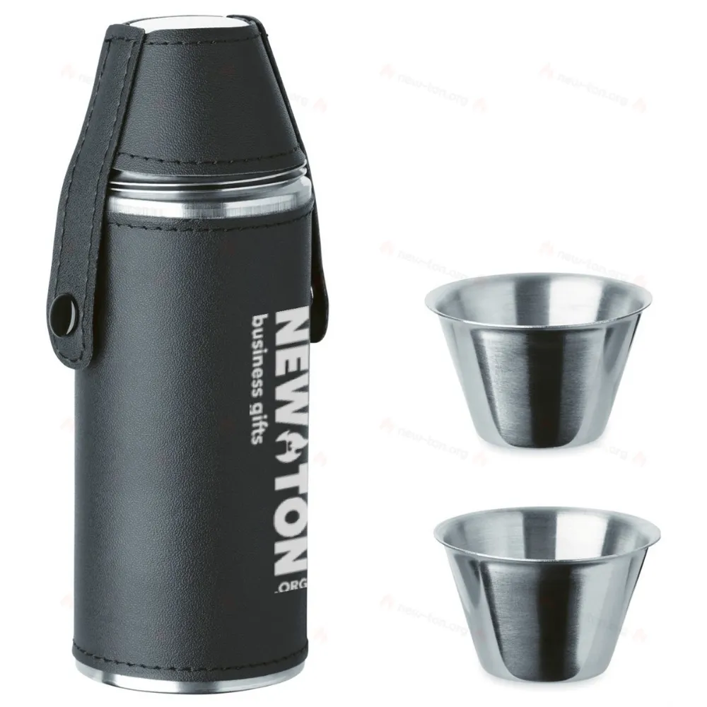 Фляжка из нержавеющей стали с поверхностью из искусственной кожи и 2 стаканчика из нержавеющей стали объемом 20 мл. Емкость фляги: 230 мл.