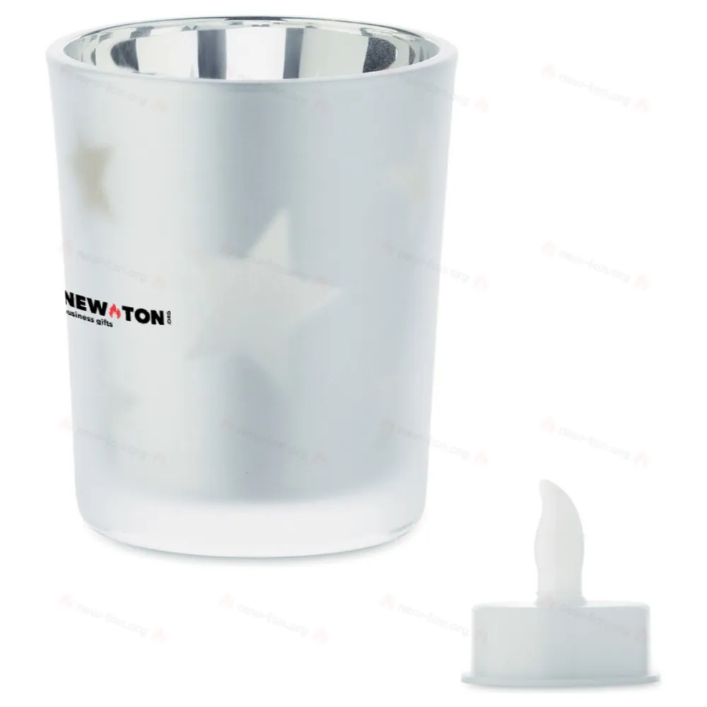 Светодиодная новогодняя свеча из пластика в стеклянном подсвечнике. В комплект входит 1 батарейка CR2032.