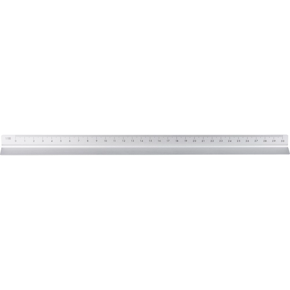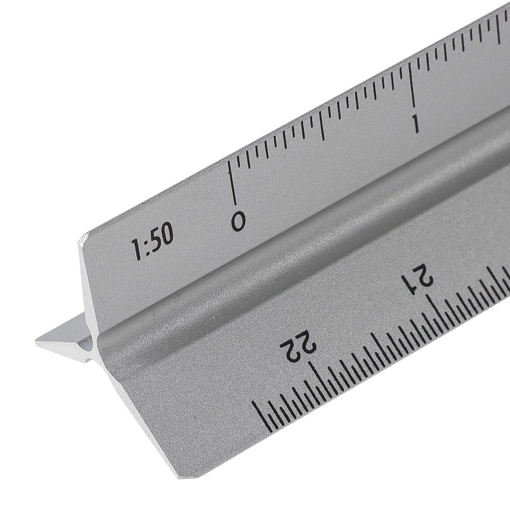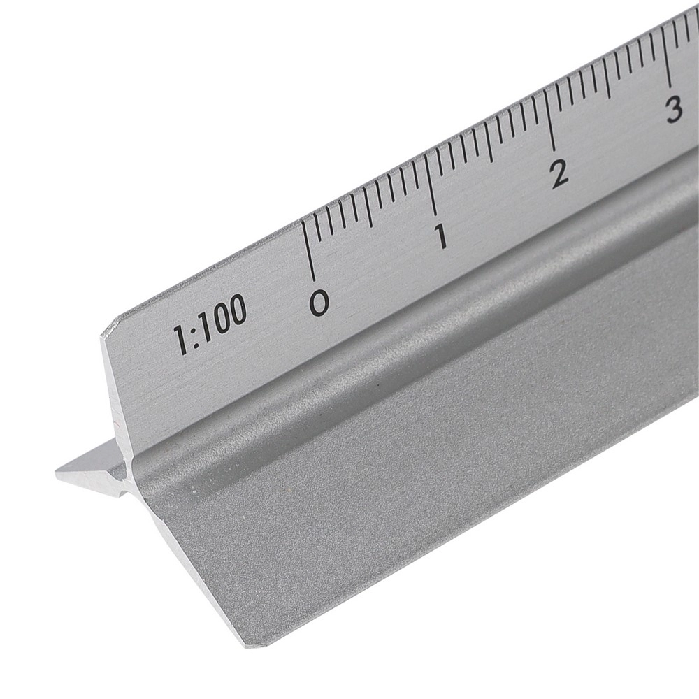 Треугольный линейка длиной 30 см с различными шкалами: 1:20, 1:25, 1:50, 1:75, 1:100, упакована индивидуально в коричневую картонную коробку, изготовлена из алюминия.