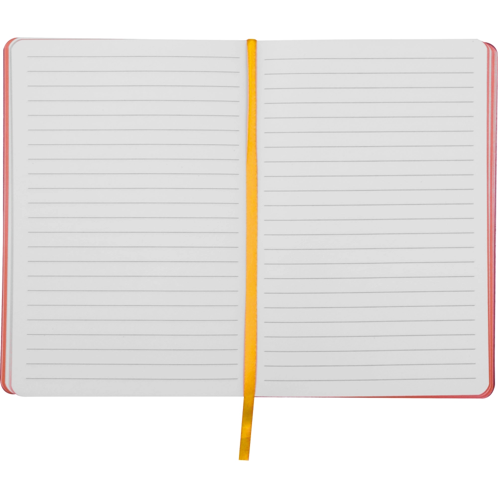 Серый блокнот формата A5, изготовленный из переработанного полиуретана, с 160 линованными страницами из переработанной бумаги и окрашенными краями страниц.