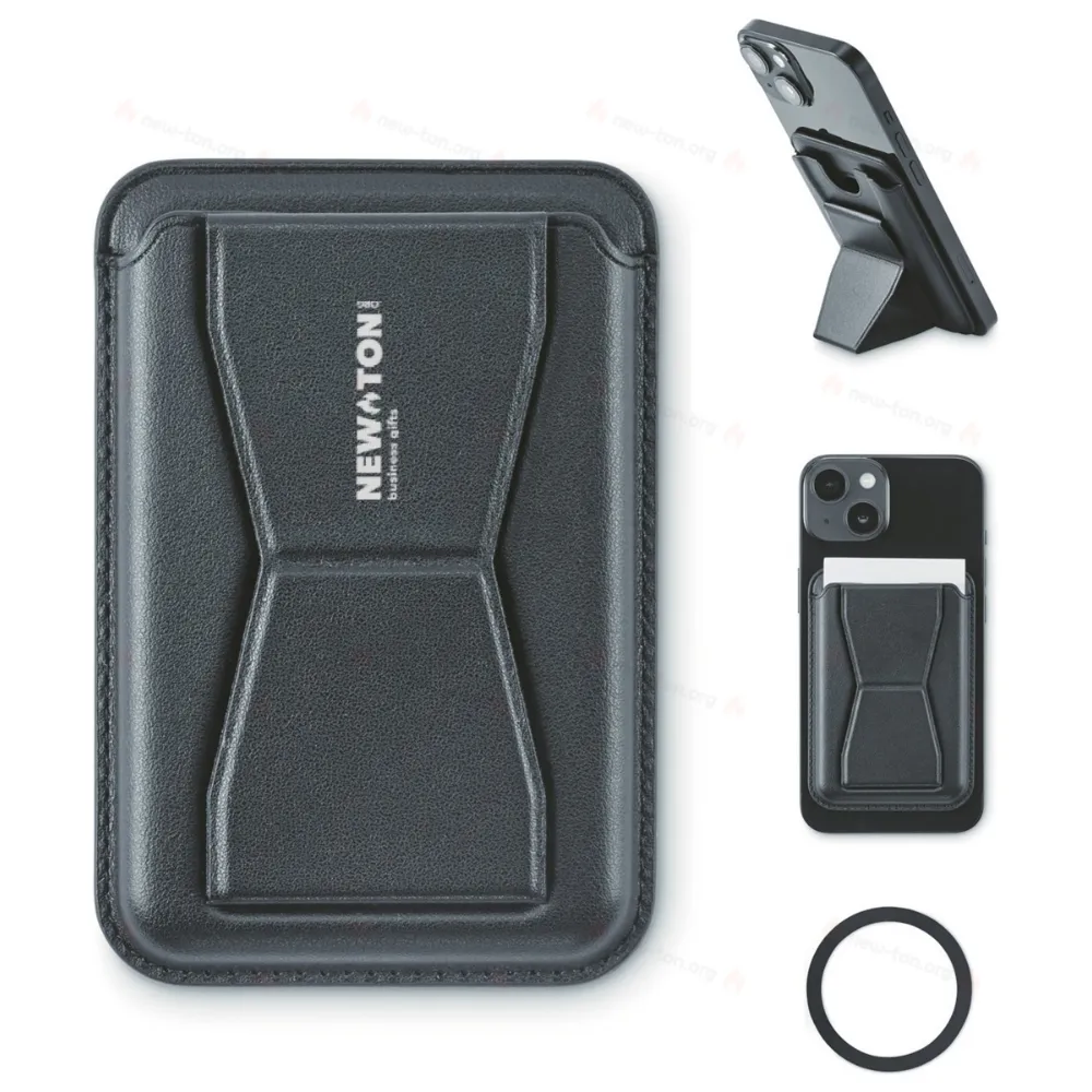 Чехол для карт из искусственной кожи (для 2 карт) с функцией подставки и магнитной застежкой. Подходит для iPhone® 12 и новее. Включает магнитное металлическое кольцо для зарядки других немагнитных беспроводных устройств.