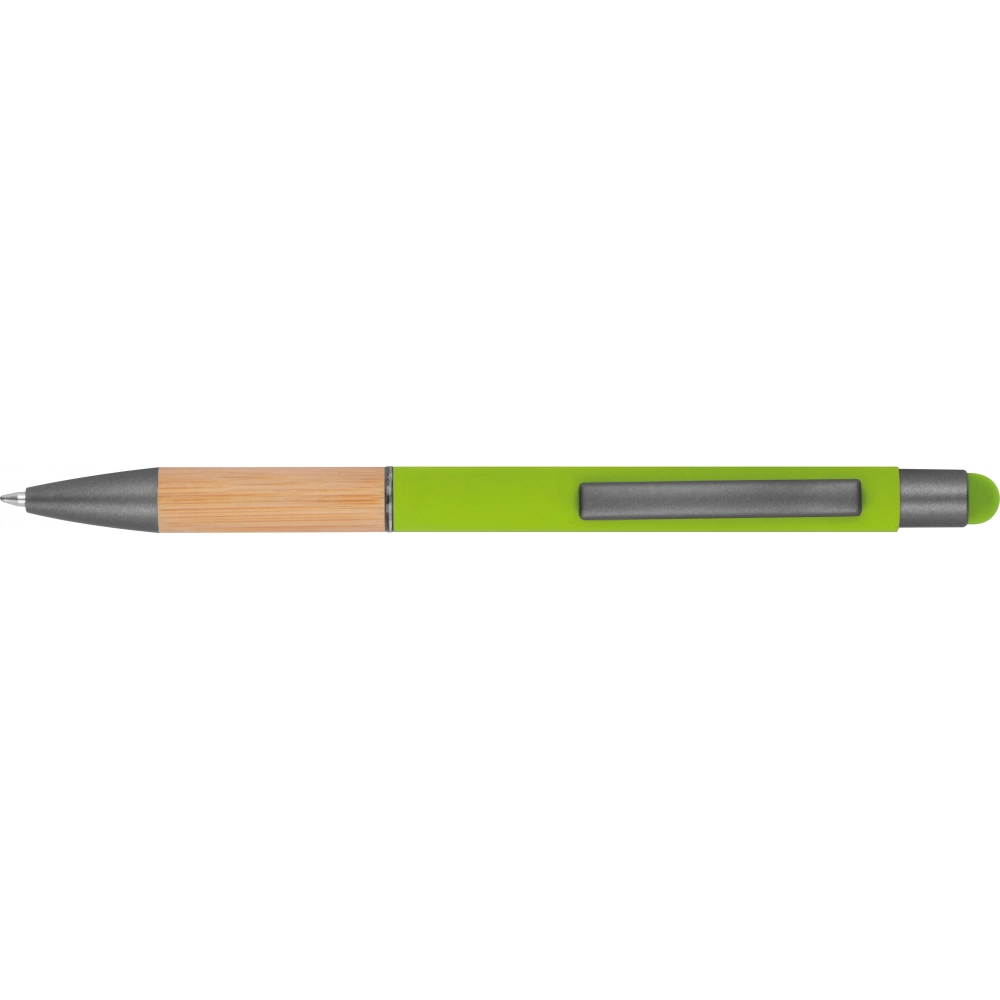 Шариковая ручка из алюминия с синим стержнем, функцией сенсорного экрана, матовыми серебристыми элементами и бамбуковой зоной захвата.