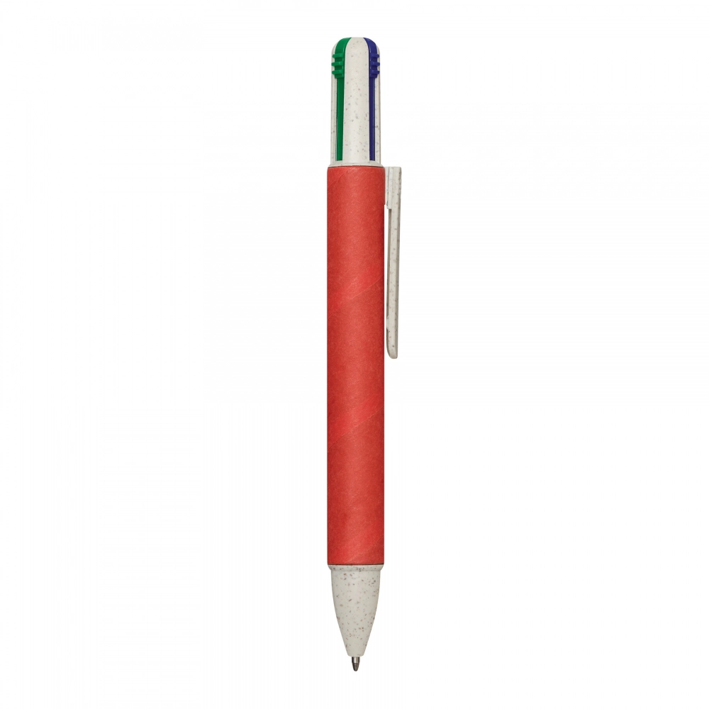 Многоцветная шариковая ручка MUCO, четыре цвета: изготовлена из пшеничной соломы и ABS, корпус покрыт переработанным картоном, механизм нажима, стержни с черными, красными, синими и красными чернилами