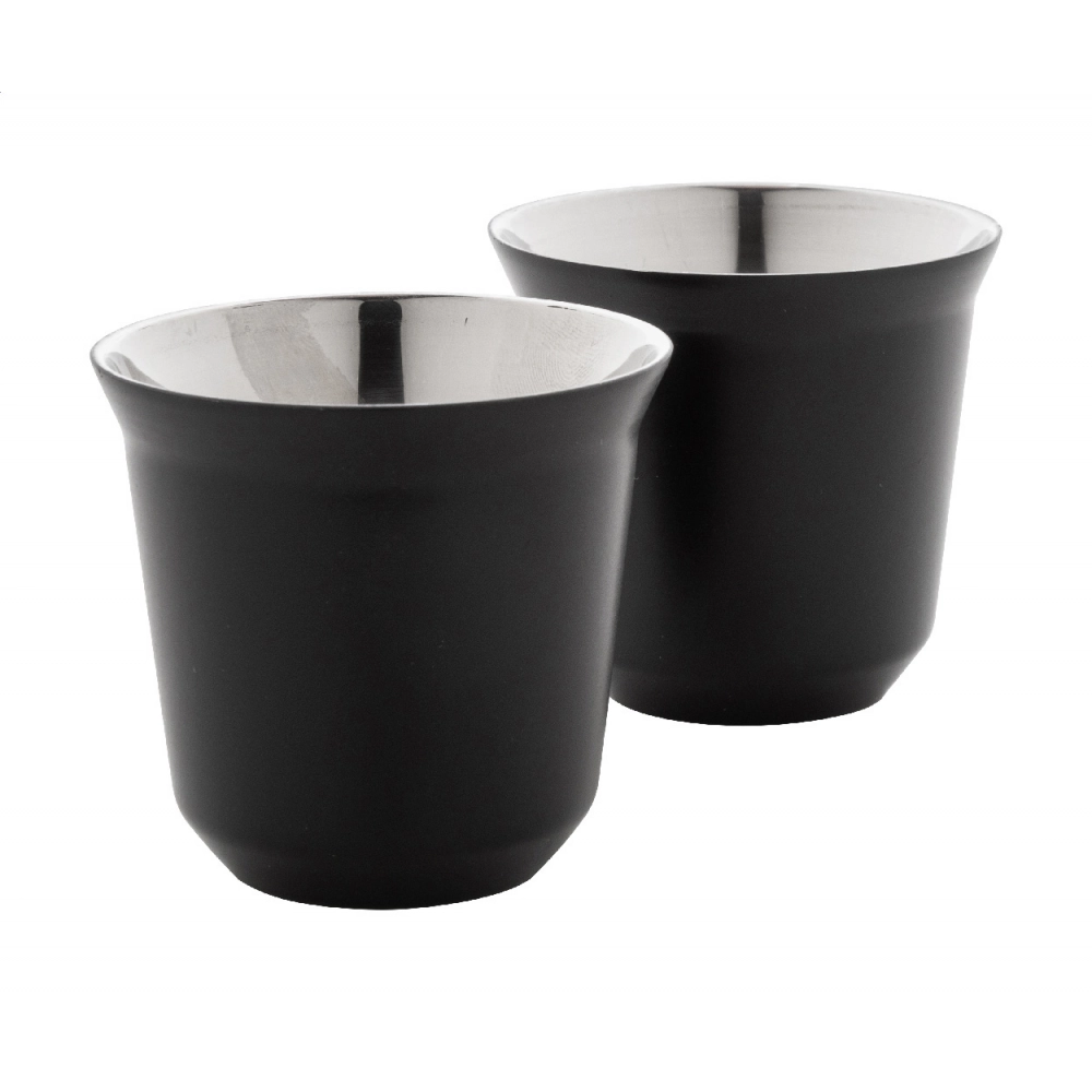 Набор из 2 чашек для эспрессо в форме кофейной капсулы с двойными стенками из утепленной нержавеющей стали, вместимостью 80 мл. Поставляется в коробке из крафт-бумаги.