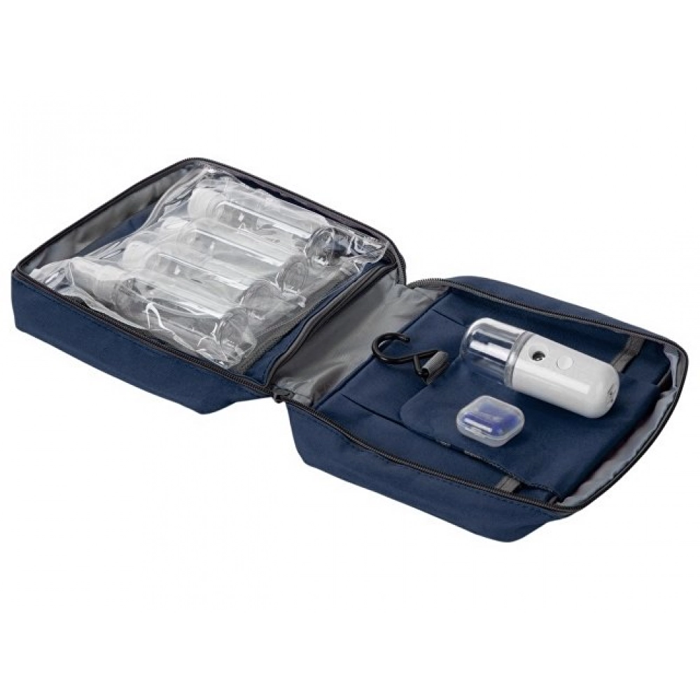 Практичный, легкий и компактный набор для путешествий. Аккуратный несессер можно взять в салон самолёта как ручную кладь, поэтому всё необходимое будет всегда под рукой, например, беруши, которые входят в состав сета. Флакончики объёмом 80 мл подойдут для шампуня, геля для душа и других косметических средств, один флакон оснащён распылителем. Бутылочки упакованы в прозрачный непромокаемый пакет на zip-lock застёжке, который дополнительно защищает багаж. Портативный увлажнитель для лица быстро освежит кожу и поможет сохранять ее увлажненной даже в долгих перелетах. - несессер подходит для ручной клади; - увлажнитель заряжается через usb провод (в комплекте); - всё, что нужно для путешествия на поезде или в самолёте; - время работы увлажнителя от внутреннего аккумулятора — до 3 часов.