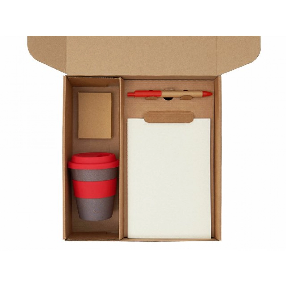 блокнот- бумага из переработанных тетра-паков, ручка- картон,пластик, стакан- 50% бамбуковое волокно, 50% полипропилен, коробка- картон