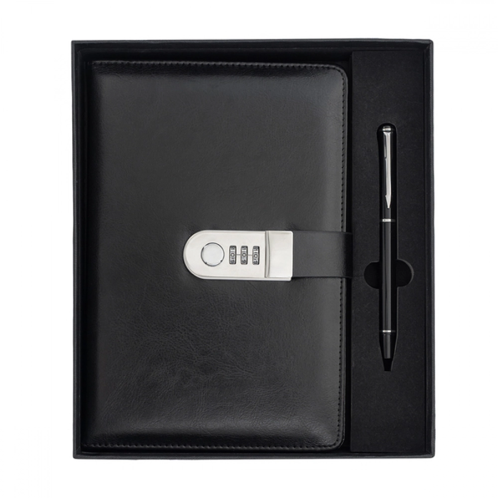 Элегантная черная блокнот на 100 страниц в линейку (80 г/м2) в обложке из эко-кожи, оснащенный кодовым замком, в комплекте с шариковой ручкой. Синий стержень. Упакован в подарочную коробку.
