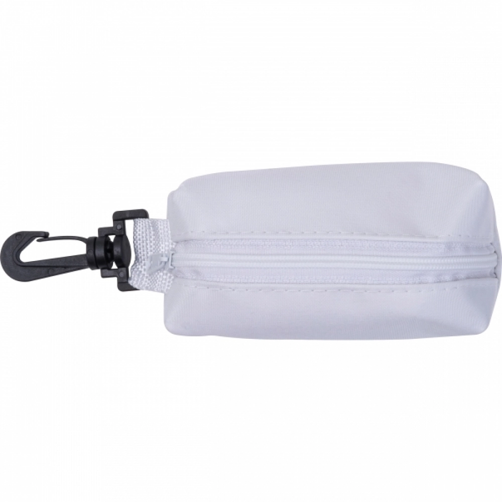 Полиэстеровая сумочка с молнией, пластиковым карабином и восемью разноцветными карандашами. Ваш логотип нанесен на сумочку.