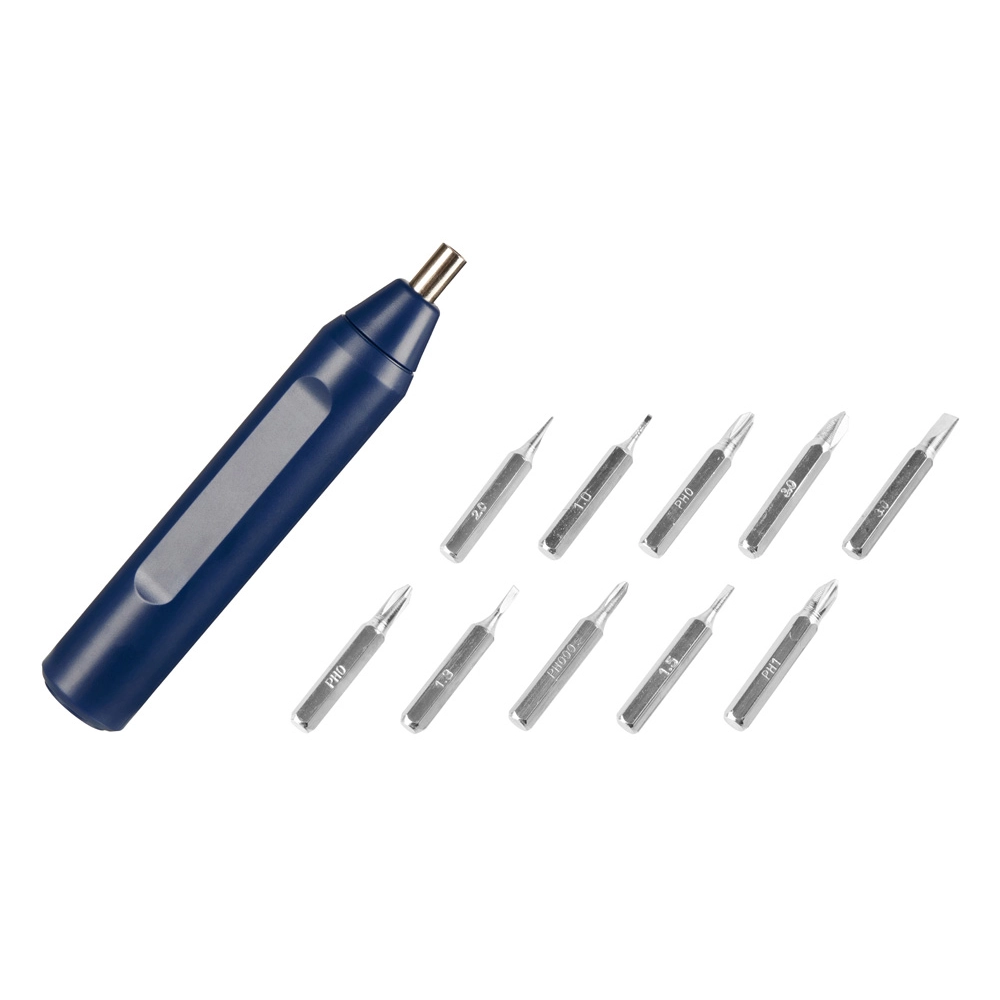 Отвертка-ручка «Drill» это универсальная отвертка с сменными битами. Благодаря форме корпуса идеально лежит в руке. Отвертка легкая и занимает мало места. Выдвижной механический контейнер бит позволяет хранить в себе весь набор из 10 сменных бит. Ручка инструмента изготовлена из пластика, биты – из нержавеющей стали.