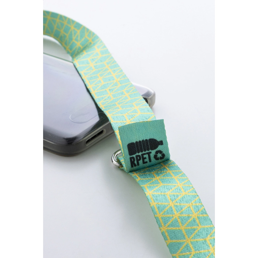 Изготовленный на заказ держатель для мобильного телефона из RPET с металлическим карабином и вставкой для телефона из нервущейся бумаги. С нанесением сублимационной печати на обеих сторонах. Минимальный заказ: 100 шт.