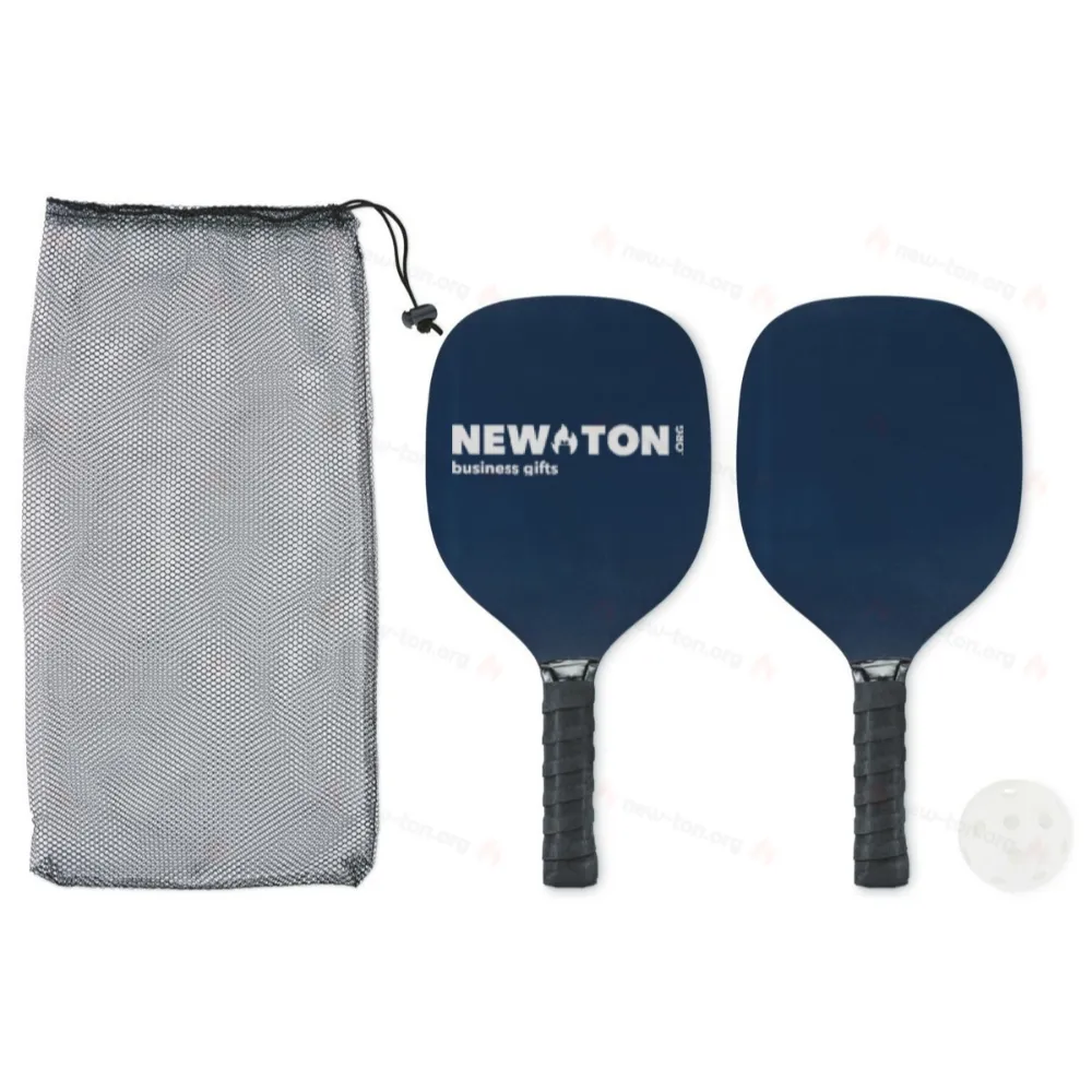 Набор для игры в пиклбол (вид спорта, сочетающий в себе элементы бадминтона, тенниса и настольного тенниса) с 2 деревянными ракетками из МДФ и мячом в сетчатом чехле из RPET на шнурке.