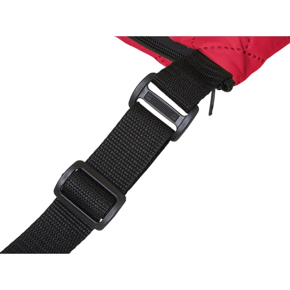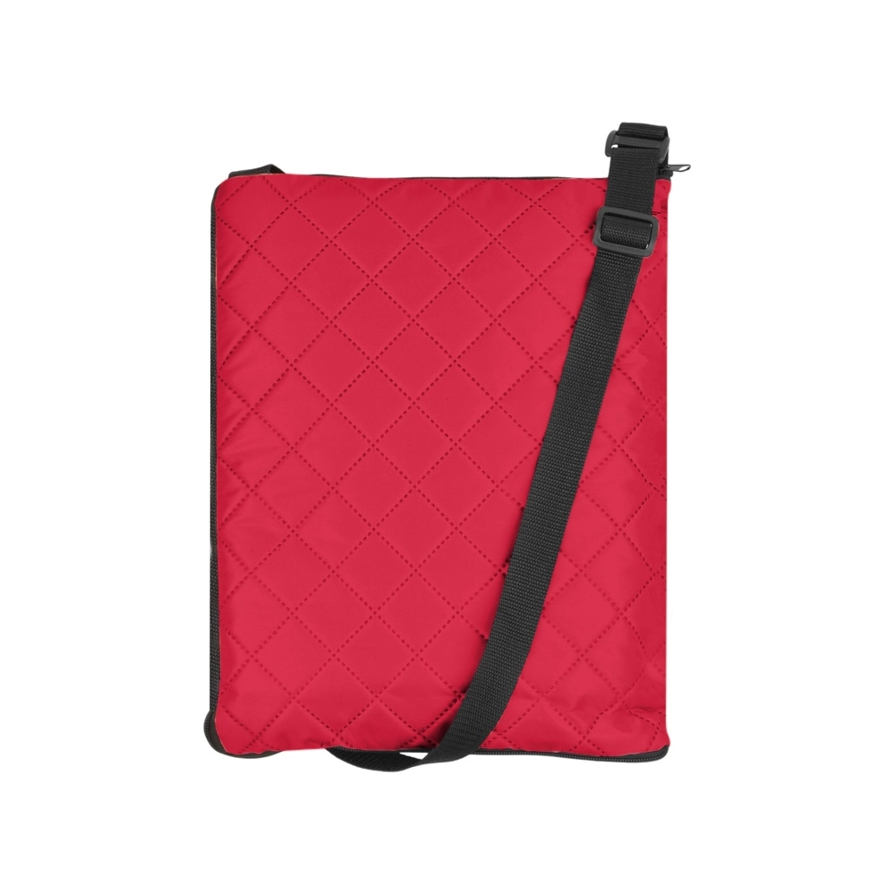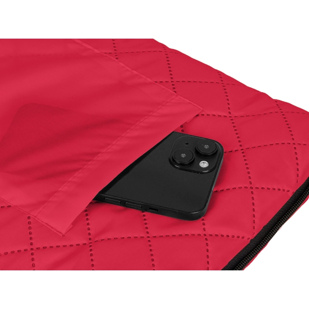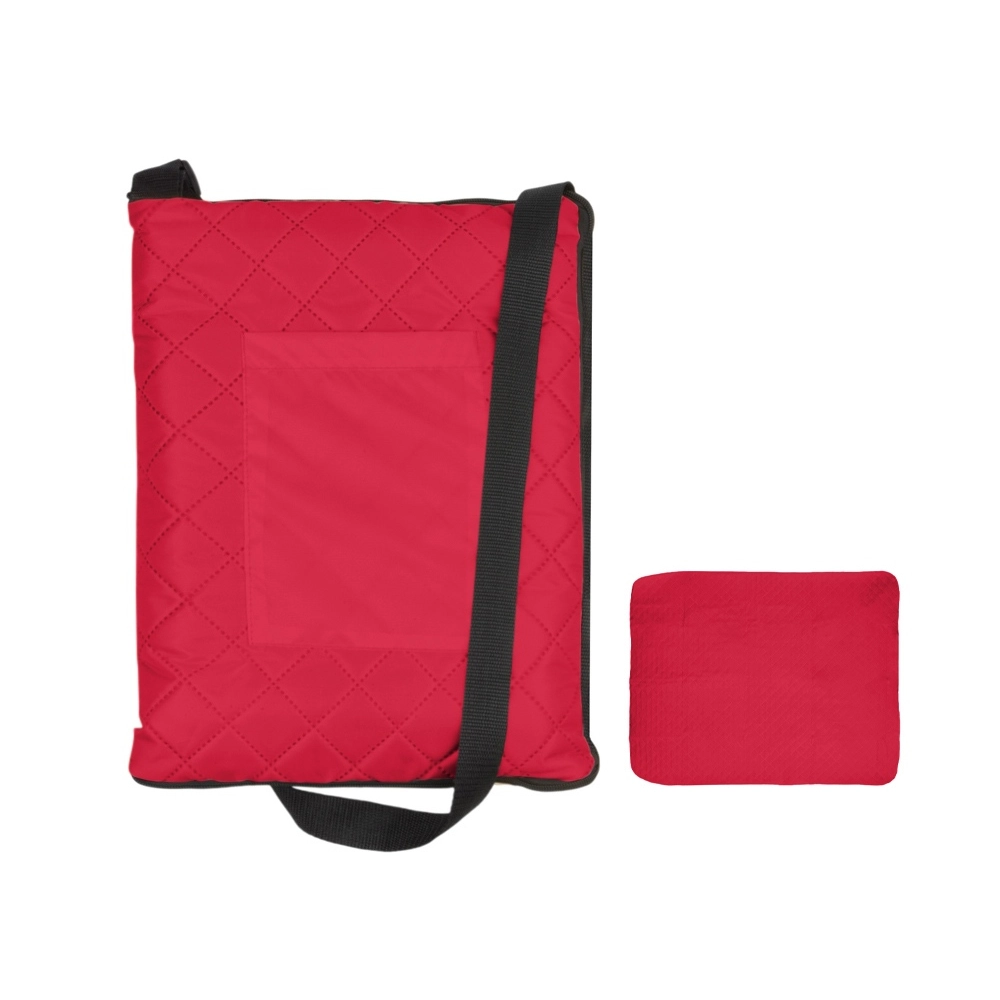 Двухсторонний плед с водоотталкивающим покрытием с одной стороны и мягким флисом с другой. Складывается в сумку на плечо и фиксируется с помощью молнии. В собранном виде имеет регулируемый по длине ремень для переноски и наружный карман для мелочей.