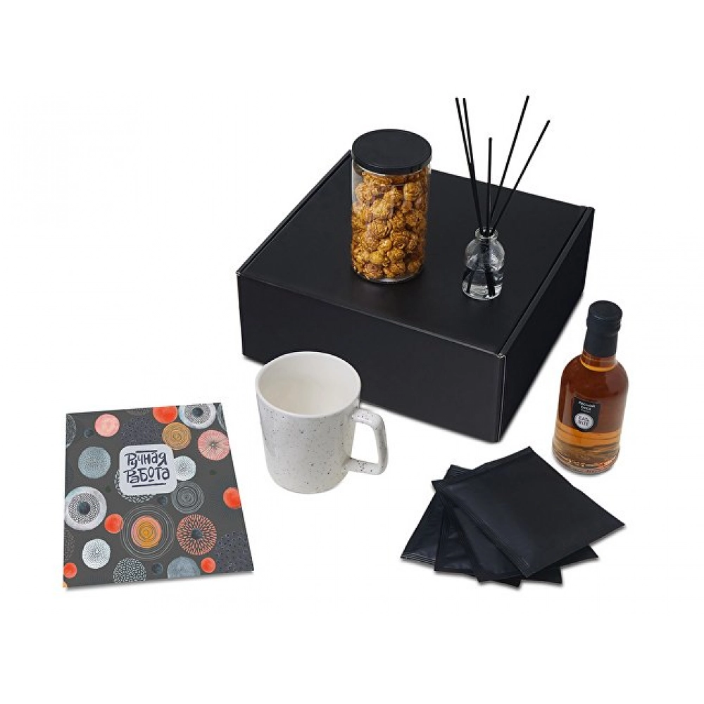 диффузор - стекло, кофе в дрип пакете - пластик, кружка - костяной фарфор, попкорн - пластик, металл, мешок - нетканый материал (спанбонд), коробка - картон