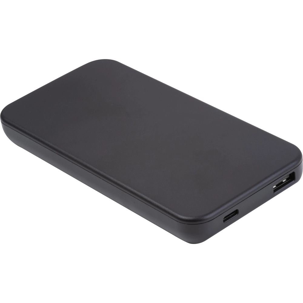 Повербанк (10,000 мАч) из переработанного пластика (RABS) с двумя портами: USB-C вход/выход 5В/2.1А и USB-A выход 5В/2.1А. В комплекте кабель для зарядки длиной 50 см.