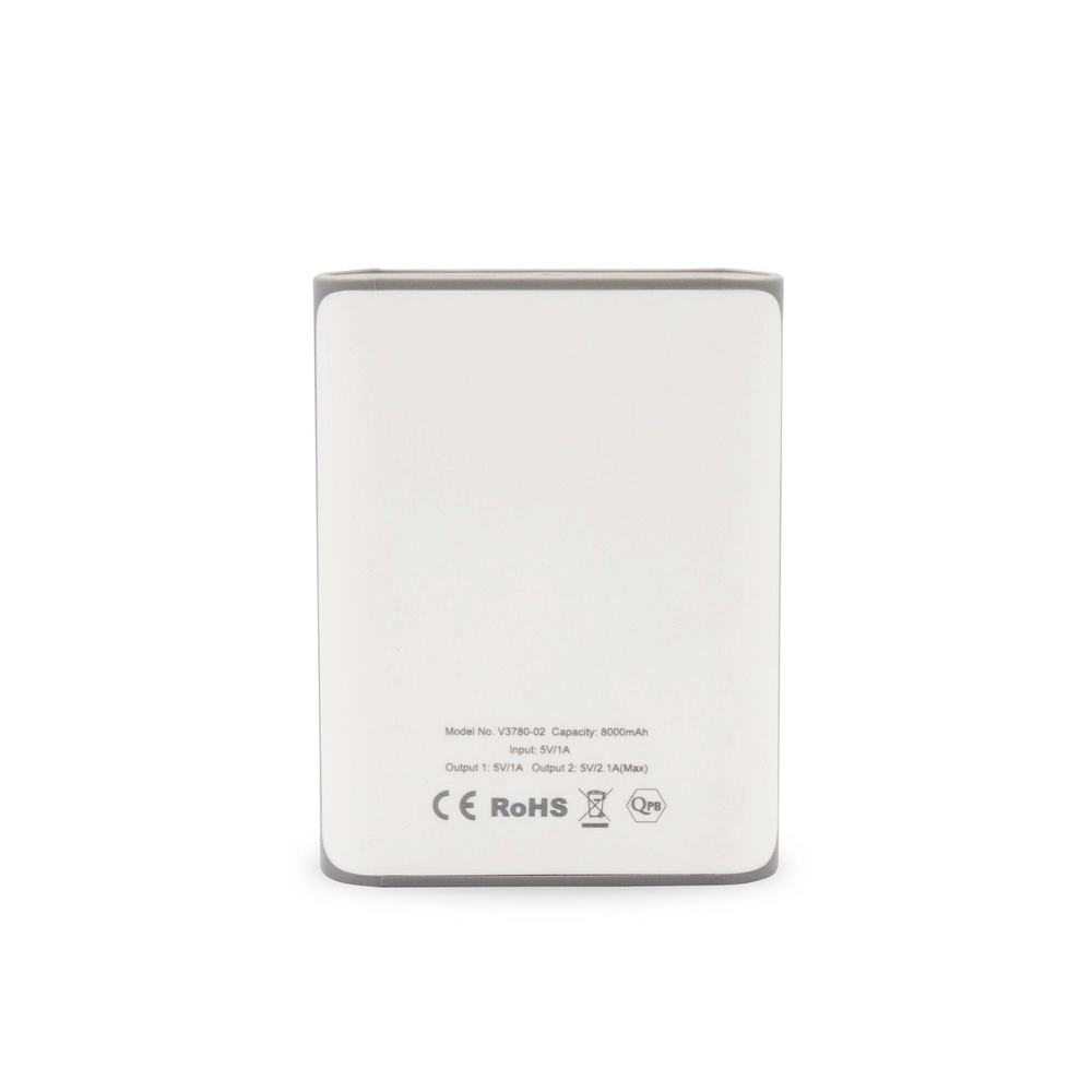 Power bank 8000 mAh, выход 5V/2.1A и 5V/1A, вход 5V/1A, 5 диодов, указывающих уровень заряда, светодиодный фонарик, в комплекте микро-USB кабель.