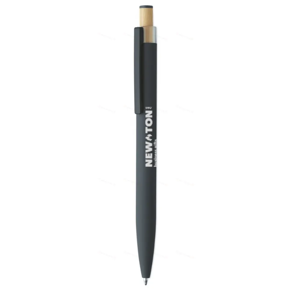 Шариковая ручка из переработанного алюминия с кнопкой из бамбука с цветными деталями и металлическим клипом. Синие чернила.