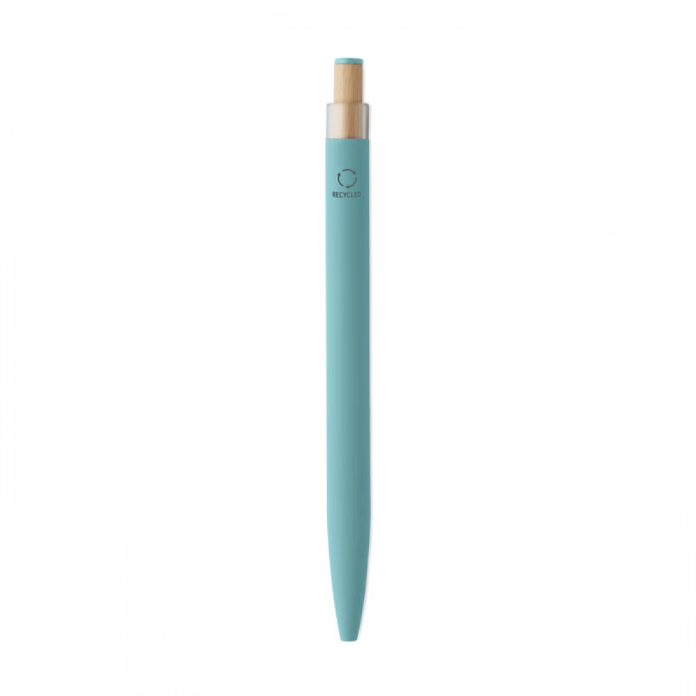 Recycled aluminium push ball pen with bamboo button with matching colour detail and matching metal clip. Blue ink.