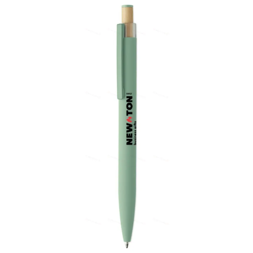Шариковая ручка из переработанного алюминия с кнопкой из бамбука с цветными деталями и металлическим клипом. Синие чернила.
