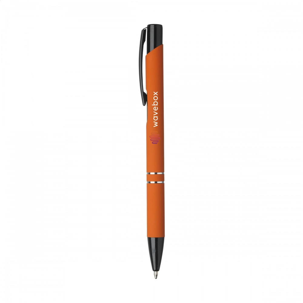 Шариковая ручка с синей пастой, с черной окрашенной кнопкой/зажимом и наконечником, с хромированными вставками. Корпус имеет резиновое покрытие.